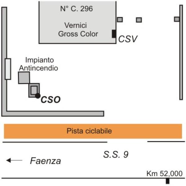 | Contrassegni | [{"simbolo_contrassegno":"B4","materializzazione":"(CSO) Centrino Universale GPS infisso nello spigolo Ovest del tombino pi\u00f9 vicino alla strada del gruppo adiacente al pozzetto dell'impianto antincendio."},{"simbolo_contrassegno":"V4","materializzazione":"(CSV) – Piastrina IRTA infissa sulla parete laterale destra dell'edificio, in prossimit\u00e0 dello spigolo sinistro, parzialmente coperta da una cassetta."}] |