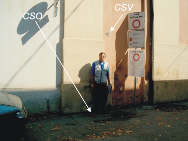 [{"simbolo_contrassegno":"P5","materializzazione":"(CSO) Pozzetto di IV\u00b0 Cat. interrato e rialzato con tubo di PVC e coperchio di ghisa, alla base del muro di fiancata sul Viale Livio Salinatore, in corrispondenza della lesena da cui inizia il muro di cinta (ARPA N\u00b0 110140)."},{"simbolo_contrassegno":"V4","materializzazione":"(CSV) Piastrina del Comune di Forl\u00ec, con cilindretto sporgente e linea di fede infissa sulla sporgenza, in corrispondenza del CSO. Presubilmente rimossa e ricollocata pi\u00f9 in alto."}]