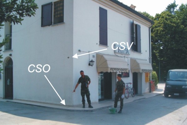 [{"simbolo_contrassegno":"P3","materializzazione":"(CSO) Chiusino in ghisa di III\u00b0 Cat. interrato alla base della facciata laterale sinistra del bar \"Pepita\", in corrispondenza dello spigolo destro, ora coperto da chiusino in cemento quadrato (ARPA N\u00b0 115080)."},{"simbolo_contrassegno":"V2","materializzazione":"(CSV) – Piastrina in ghisa IGM infissa sulla stessa facciata del CSO, in corrispondenza.."}]
