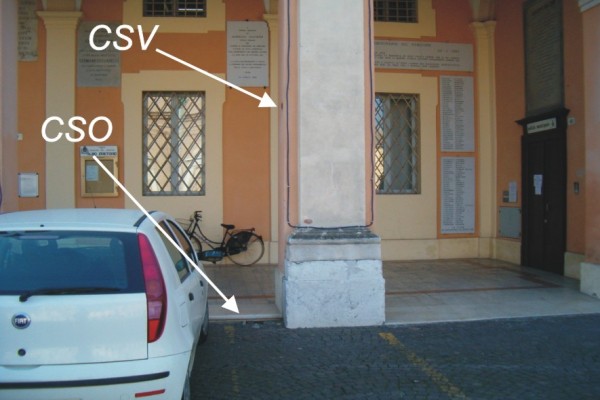 | Contrassegni | [{"simbolo_contrassegno":"P3","materializzazione":"(CSO) Chiusino in ghisa di III\u00b0 Cat. interrato alla base del secondo pilastro, a destra dell'entrata. Protetto da mattonella in porfido quadrata (ARPA N\u00b0 120010). A non misurabile."},{"simbolo_contrassegno":"V2","materializzazione":"(CSV) – Piastrina in ghisa IGM infissa sullo stesso pilastro, in corrispondenza del CSO ."}] |