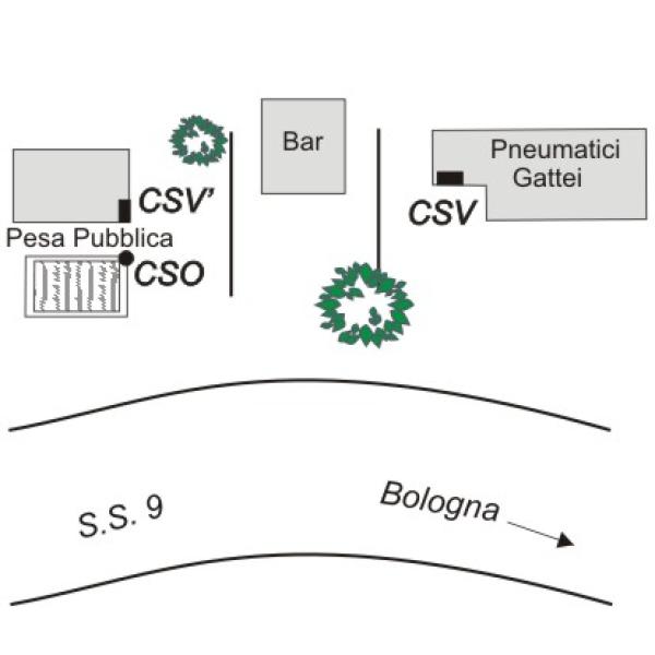 [{"simbolo_contrassegno":"B2","materializzazione":"(CSO) Chiodo anonimo AGIP infisso sullo spigolo pi\u00f9 vicino al CSV' della cornice in calcestruzzo della pesa pubblica (ARPA N\u00b0 120020)."},{"simbolo_contrassegno":"V4","materializzazione":"(CSV) – Piastrina del Consorzio Bonifica Forlivese infissa sulla facciata dell'officina Pneumatici Gattei, in prossimit\u00e0 dello spigolo sinistro."},{"simbolo_contrassegno":"V4","materializzazione":"(CSV') – Piastrina IRTA infissa sulla parete laterale destra del casotto della pesa, spigolo sinistro."}]