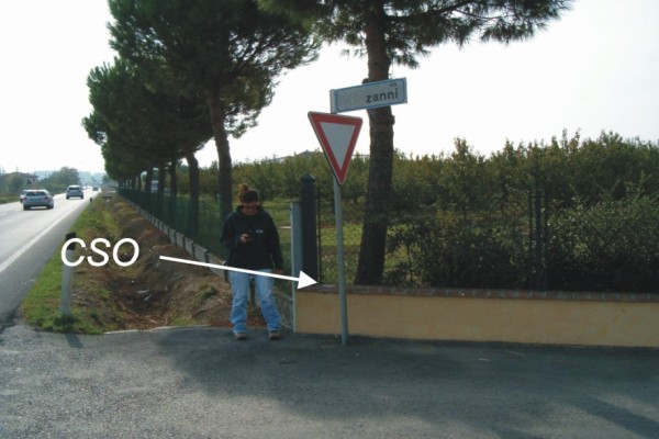 | Contrassegni | [{"simbolo_contrassegno":"B2","materializzazione":"(CSO) Chiodo anonimo ARPA infisso sulla sommit\u00e0 del muro di recinzione all'angolo tra Via Zanni con la S.S. 9 (ARPA N\u00b0 120041)."}] |