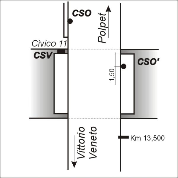 | Contrassegni | [{"simbolo_contrassegno":"B1","materializzazione":"(CSO) – Bullone infisso nel muro di sostegno in pietra in prossimit\u00e0 dello spigolo dell'ingresso al civico n\u00b011."},{"simbolo_contrassegno":"B5","materializzazione":"(CSO') – Disco metallico impiombato del Catasto sulla banchina di destra del sottopasso direzione Polpet a mt 1,50 dalla colonna lato nord."},{"simbolo_contrassegno":"V4","materializzazione":"(CSV) – Piastrina del Catasto infissa sulla porta di sinistra opposta al CSO'."}] |