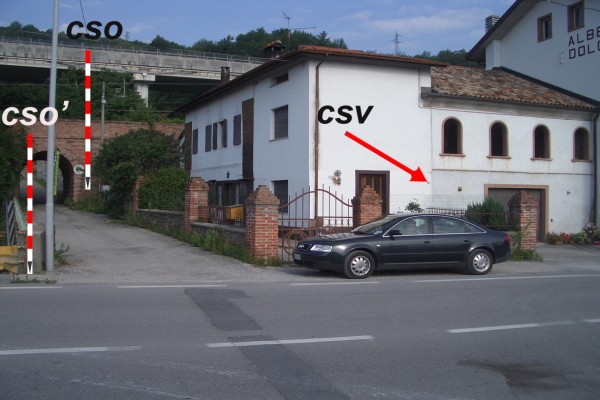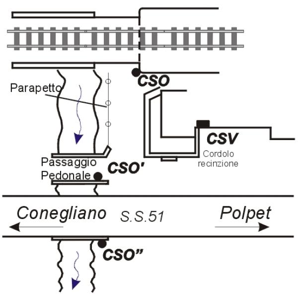 | Contrassegni | [{"simbolo_contrassegno":"B1","materializzazione":"(CSO) – Bullone infisso nel muro di sostegno a destra del sottopasso della ex ferrovia."},{"simbolo_contrassegno":"B5","materializzazione":"(CSO') – Disco metallico impiombato del Catasto sul passaggio pedonale del ponte, a monte riva sinistra."},{"simbolo_contrassegno":"V4","materializzazione":"(CSV) – Piastrina del Catasto infissa sulla facciata del fabbricato di sinistra."},{"simbolo_contrassegno":"B2","materializzazione":"(CSO) – Chiodo della Regione Veneto infisso sulla sommit\u00e0 del muro di sostegno dall'altro lato della strada, di fronte al CSO'."}] |