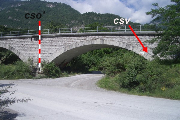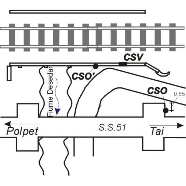 | Contrassegni | [{"simbolo_contrassegno":"P3","materializzazione":"(CSO) – Chiusino in ghisa addossato all'estremit\u00e0 del marciapiede a monte,riva sinistra del ponte sul fiume Desedan."},{"simbolo_contrassegno":"B1","materializzazione":"(CSO') – Bullone infisso alla base del pilone sinistro successivo al pilone dove \u00e8 posto il CSV."},{"simbolo_contrassegno":"V1","materializzazione":"(CSV) – Mensola infissa sul primo arco del ponte della ferrovia.Non misurata."}] |