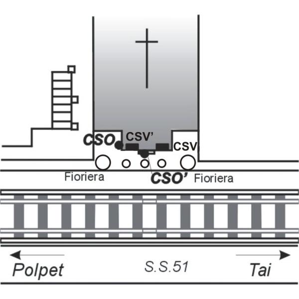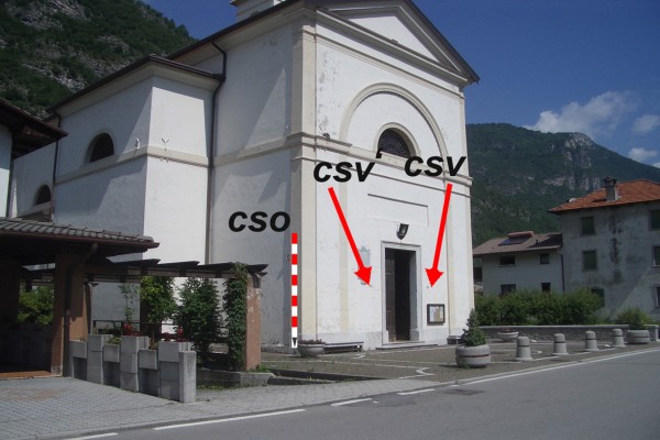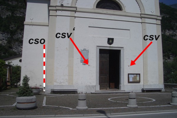 | Contrassegni | [{"simbolo_contrassegno":"B1","materializzazione":"(CSO) – Bullone infisso sulla parete laterale sinistra della facciata in prossimit\u00e0 dello spigolo destro,alla base della colonna d'angolo con la facciata."},{"simbolo_contrassegno":"V1","materializzazione":"(CSV) – Mensola infissa sulla facciata,a destra della porta."},{"simbolo_contrassegno":"V3","materializzazione":"(CSV') – Piastrina antica infissa sulla facciata,a sinistra della suddetta porta."},{"simbolo_contrassegno":"B5","materializzazione":"(CSO') – Disco metallico impiombato sulla soglia della porta a sinistra entrando."}] |