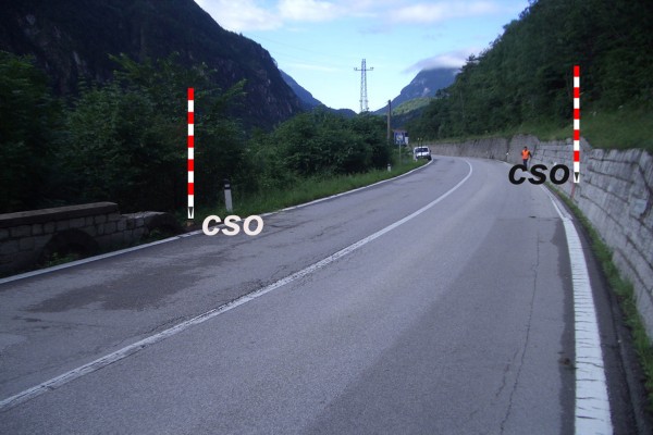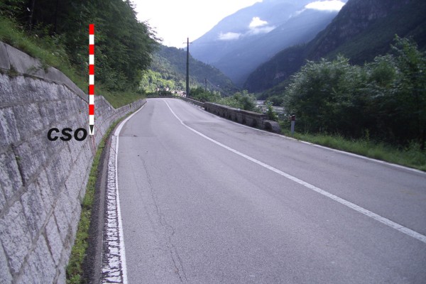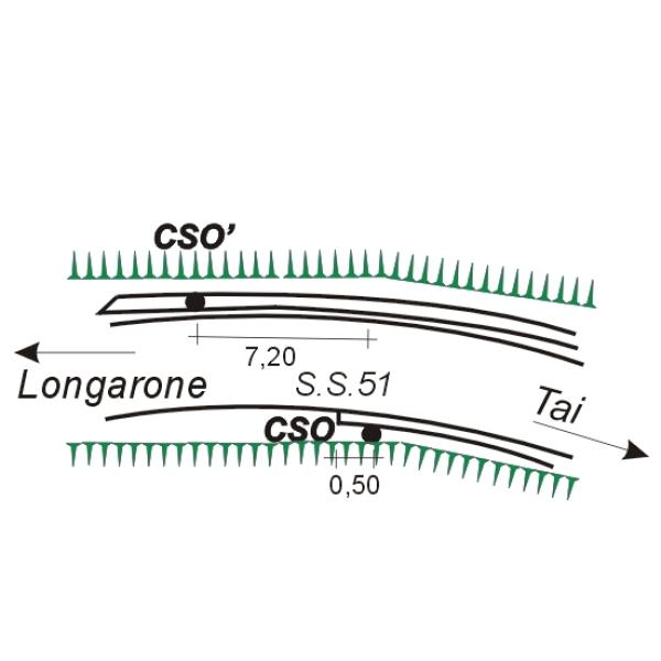| Contrassegni | [{"simbolo_contrassegno":"P5","materializzazione":"(CSO) – Pozzetto rialzato con tubo in plastica e tappo in ghisa posto alla base esterna del parapetto a valle a 0,50 m. dalla testata (parziamente demolita)."},{"simbolo_contrassegno":"B1","materializzazione":"(CSO') – Bullone infisso nel muro a retta di fronte al CSO circa 7,00 m. prima verso Longarone."}] |