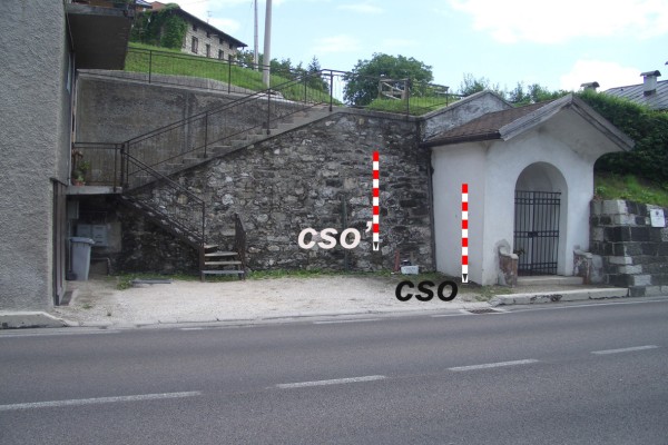 [{"simbolo_contrassegno":"P5","materializzazione":"(CSO) – Pozzetto rialzato con tubo in plastica e tappo in ghisa interrato alla base della parete verso Cortina presso lo spigolo destro della cappella."},{"simbolo_contrassegno":"B1","materializzazione":"(CSO') – Bullone infisso nel muro di sostegno in pietra a sinistra della cappella a 1.27 m. dallo spigolo."}]