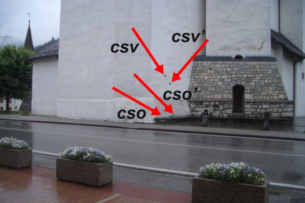 [{"simbolo_contrassegno":"P2","materializzazione":"(CSO) – Chiusino in ghisa posto alla base della parete laterale nell'angolo formato con il basamento del campanile lato strada della chiesa di S. Vito di Cadore."},{"simbolo_contrassegno":"P3","materializzazione":"(CSO') – Chiusino in ghisa posto a lato del CSO, protetto da coperchio anonimo. Ripristinato il contrassegno in acciaio."},{"simbolo_contrassegno":"V1","materializzazione":"(CSV) – Mensola infissa sulla parete suddetta in corrispondenza del CSO."},{"simbolo_contrassegno":"V3","materializzazione":"(CSV') – Piastrina antica infissa sul muro anzidetto a destra del CSV."}]