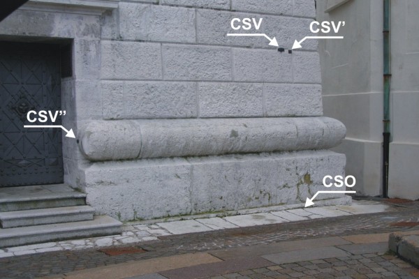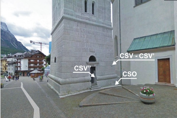 | Contrassegni | [{"simbolo_contrassegno":"B5","materializzazione":"(CSO) – Disco impiombato su una pietra del lastrico del campanile in prossimit\u00e0 dello spigolo nord-ovest a destra dell' ingresso a m. 1,10 dallo spigolo stesso."},{"simbolo_contrassegno":"V2","materializzazione":"(CSV) – Piastrina a barilotto cementata sulla facciata d' ingresso al campanile in corrispondenza del CSO."},{"simbolo_contrassegno":"V4","materializzazione":"(CSV') – Piastrina di altro ente in bronzo, quadrata con foro, infissa 15 cm a destra del CSV."},{"simbolo_contrassegno":"V4","materializzazione":"(CSV'') – Piastrina del comune di Cortina (n\u00b012) infissa sulla pietra di cordonatura, a destra della porta di ingresso al campanile, sopra alla soglia."}] |