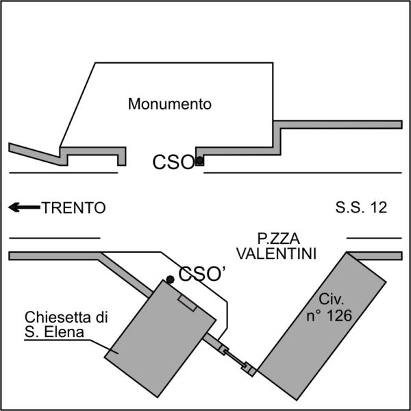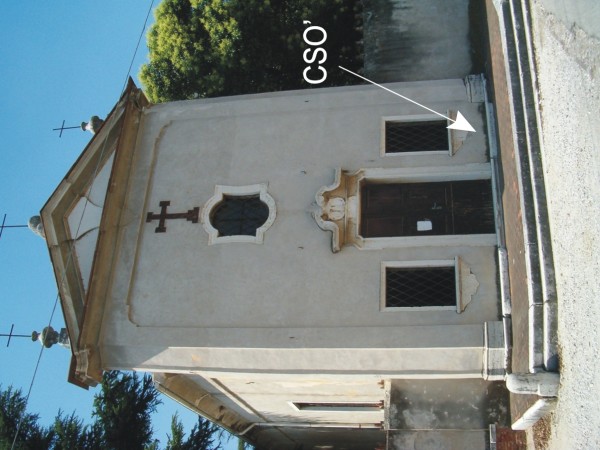 [{"simbolo_contrassegno":"B2","materializzazione":"(CSO) – Chiodo anonimo infisso sulla sommit\u00e0 del muretto a destra di recinzione del monumento."},{"simbolo_contrassegno":"B3","materializzazione":"(CSO') – Cerchio inciso posto sul gradino di marmo sotto la finestra di destra della facciata della chiesetta"}]