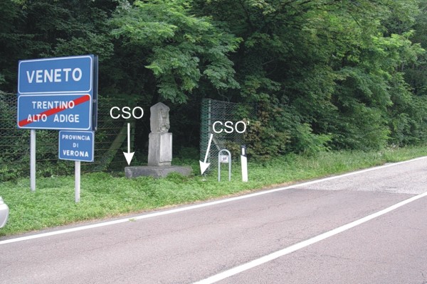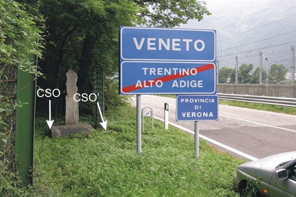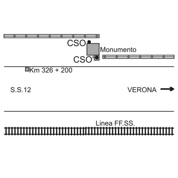 | Contrassegni | [{"simbolo_contrassegno":"B1","materializzazione":"(CSO) – Bullone infisso nella parte posteriore della stele monumentale in pietra posta sulla destra in direzione di Rovereto"},{"simbolo_contrassegno":"B4","materializzazione":"(CSO') – Centrino universale infisso sulla destra della platea in calcestruzzo a fianco della stele monumentale"}] |