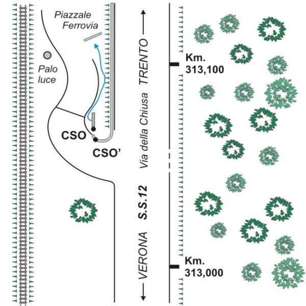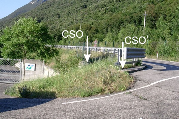 [{"simbolo_contrassegno":"B1","materializzazione":"(CSO) – Bullone infisso sull'estremit\u00e0 a destra del muro in cemento armato sovrastante il chiavicotto a destra del cancello di accesso FF.SS."},{"simbolo_contrassegno":"B4","materializzazione":"(CSO') – Centrino universale posto alla testa del muretto del guard rail in direzione Verona"}]