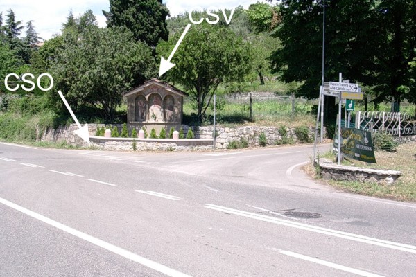 | Contrassegni | [{"simbolo_contrassegno":"P3","materializzazione":"(CSO) – -Chiusino in ghisa rialzato con tubo in PVC e protetto da tappo in ghisa, posto alla base dello spigolo sinistro del muretto di recinzione del tabernacolo. Alto non misurabile."},{"simbolo_contrassegno":"V1","materializzazione":"(CSV) – Mensola infissa nel muro posteriore del tabernacolo"}] |