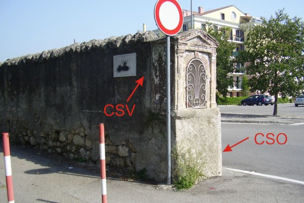 | Contrassegni | [{"simbolo_contrassegno":"B1","materializzazione":"(CSO) – Bullone infisso nella parte posteriore del basamento del tabernacolo sulla S.P.1a (Via Ca' di Cozzi) angolo via S.Rocco."},{"simbolo_contrassegno":"B4","materializzazione":"(CSO') – Centrino universale infisso sul muretto di una aiuola spartitraffico che delimita un parcheggio in Via S. Rocco a circa 90 m dal CSO."},{"simbolo_contrassegno":"V4","materializzazione":"(CSV) – Piastrina di altro ente, Catasto, infissa sul muro di Via S. Rocco adiacente al Tabernacolo"}] |