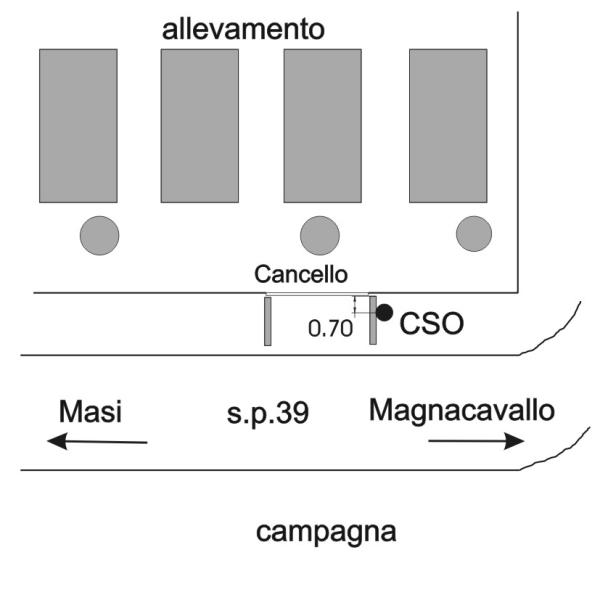 | Contrassegni | [{"simbolo_contrassegno":"B1","materializzazione":"(CSO) Bullone infisso sul ponticello in calcestruzzo lato est in prossimit\u00e0 del cancello d'ingresso all'allevamento."}] |