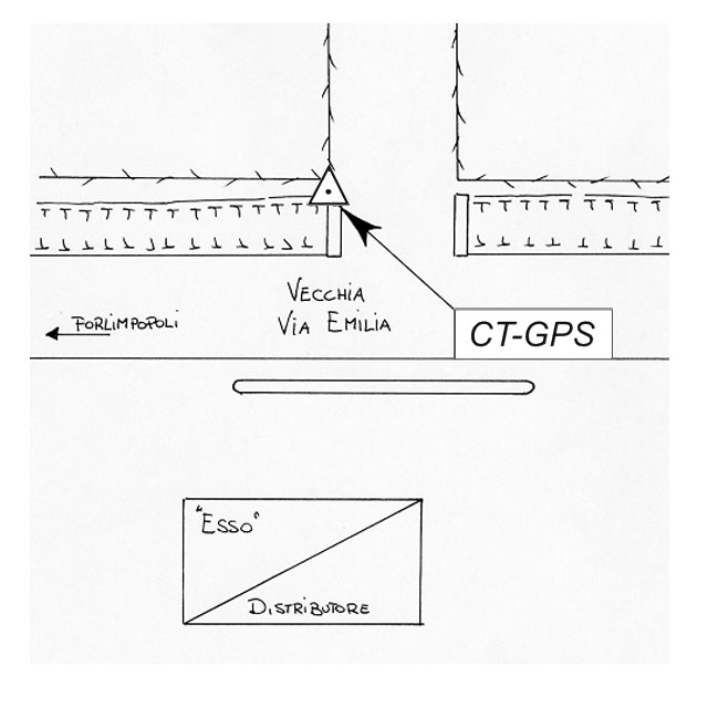 | Materializzazione | Centrino metallico infisso sulla spalletta di un passaggio di accesso ai campi, situato davanti ad un distributore ESSO, sulla Vecchia Via Emilia. |
