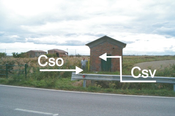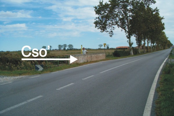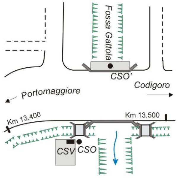 | Contrassegni | [{"simbolo_contrassegno":"P5","materializzazione":"(CSO) – Pozzetto di IV Cat. interrato alla base della parete sinistra del casottino del Consorzio, a cm 20 dallo spigolo destro. Rialzato con tubo in PVC e con coperchio in ghisa (ARPA N\u00b0 059070)."},{"simbolo_contrassegno":"B6","materializzazione":"(CSO') – Centrino di tipo \"GPS C\" infisso sulla sommit\u00e0 della chiusa posta a ridosso della spalletta Nord del ponte sulla Fossa Gattola, al centro. Misurabile con 1\/2 sfera."},{"simbolo_contrassegno":"V4","materializzazione":"(CSV) – Piastrina zincata del Catasto infissa nella facciata principale del casottino, in prossimit\u00e0 dello spigolo sinistro."}] |