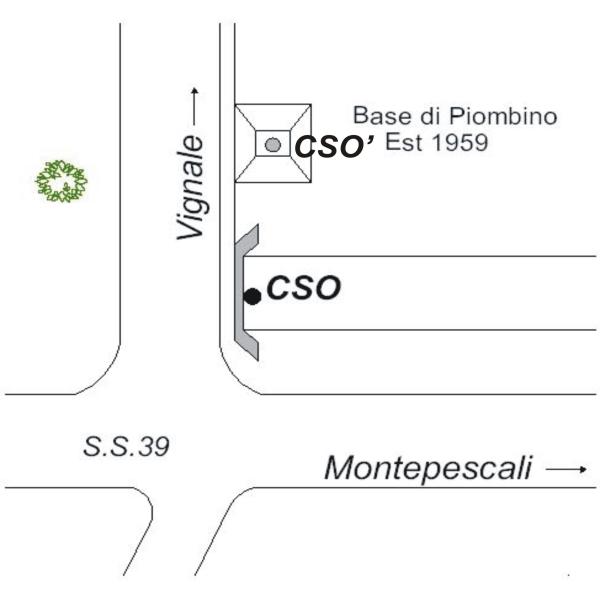 | Contrassegni | [{"simbolo_contrassegno":"B1","materializzazione":"(CSO) – Bullone infisso sulla faccia interna del tombino sul fosso che scorre parallelo alla S.P.39."},{"simbolo_contrassegno":"B6","materializzazione":"(CSO') – Centrino del tipo \"GPS A\" fissato su preesistente centrino IGM cementato alla sommit\u00e0 e al centro dell'obelisco della Base di Piombino Estremo-Est. Alla data dell' ultima ricognizione il punto risultava circondato da folta vegetazione."}] |