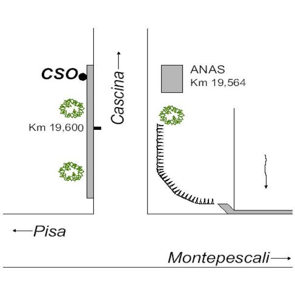 [{"simbolo_contrassegno":"B1","materializzazione":"(CSO) – Bullone infisso sul lato esterno di un parapetto, a sinistra, procedendo verso Cascina, in prossimit\u00e0 della testata del muretto opposta alla statale."}]