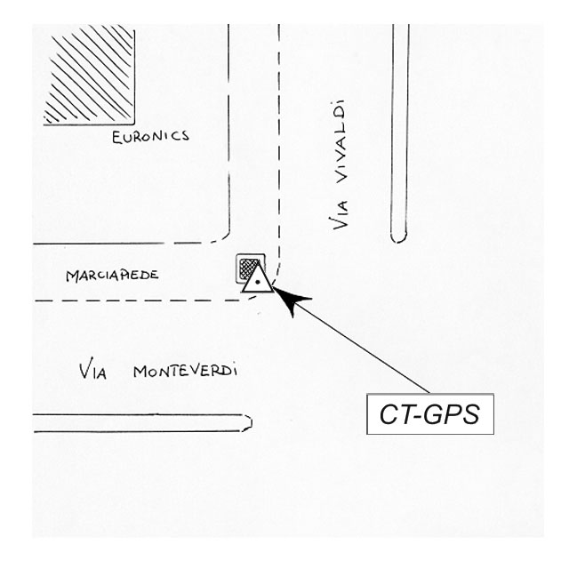 Centrino metallico infisso sullo spigolo sud-est del tombino situato all'angolo tra Via Vivaldi e Via Monteverdi.