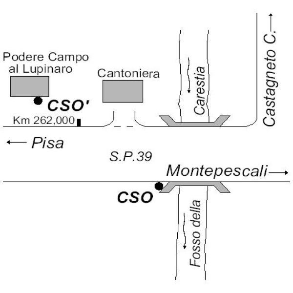 | Contrassegni | [{"simbolo_contrassegno":"B4","materializzazione":"(CSO) – Centrino universale fissato sulla testata nord, lato valle del ponticello al Km 261,900."},{"simbolo_contrassegno":"P5","materializzazione":"(CSO') – Pozzetto di IV categoria interrato alla base della facciata del fabbricato del podere al \"Lupinato\", a sinistra della porta d'ingresso, a 30 cm, rialzato con tubo in plastica e tappo in ghisa."}] |
