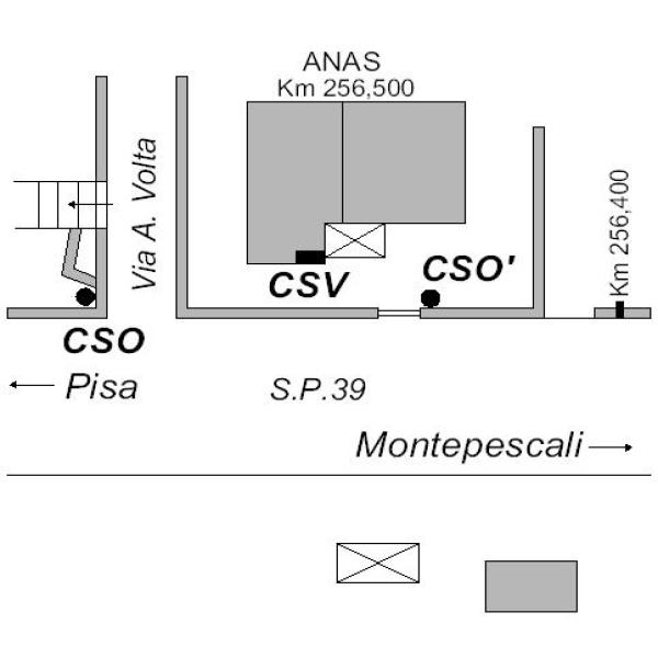 [{"simbolo_contrassegno":"B1","materializzazione":"(CSO) – Bullone infisso nel muretto interno tra via A. Volta e la S.P.39, in corrispondenza di una canaletta."},{"simbolo_contrassegno":"P3","materializzazione":"CSO) – Chiusino in ghisa di III categoria interrato alla base del pilastro destro, lato fabbricato (ANAS)."},{"simbolo_contrassegno":"V1","materializzazione":"(CSV) – Mensola infissa sull'avancorpo a 20 cm dallo spigolo destro (ANAS)."}]