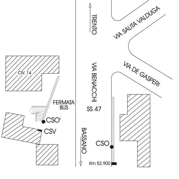 [{"simbolo_contrassegno":"B1","materializzazione":"(CSO) – Bullone IGM infisso nel muro di scarpa, all'altezza della ringhiera di confine tra i due grandi caseggiati, prossimi al Km 52.900."},{"simbolo_contrassegno":"B2","materializzazione":"(CSO') – Chiodo anonimo R.Veneto (c.s. n\u00b060) infisso sulla sommit\u00e0 e prossimo alla testa del muretto adiacente il civ. 14."},{"simbolo_contrassegno":"V1","materializzazione":"(CSV) – Mensola UIMAV infissa nella facciata destra in prossimit\u00e0 dello spigolo sinistro."}]