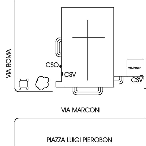 | Contrassegni | [{"simbolo_contrassegno":"B1","materializzazione":"(CSO) – Bullone R.Veneto infisso sulla facciata sinistra della chiesa, guardando dal sagrato, a destra dell'ingresso laterale."},{"simbolo_contrassegno":"V4","materializzazione":"(CSV) – Piastrina di altro Ente UIMAV infissa in prossimit\u00e0 del CSO, a destra dello stesso."},{"simbolo_contrassegno":"V3","materializzazione":"(CSV') – Piastrina antica IGM infissa sulla facciata del campanile, lato via Marconi, a destra della porta in legno."}] |