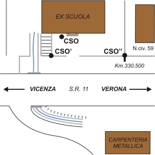 [{"simbolo_contrassegno":"P5","materializzazione":"(CSO) – Pozzetto interrato alla base della facciata, a sinistra della porta d'ingresso dell'edificio della vecchia Scuola in prossimit\u00e0 del Km 330,500 della S.R. 11."},{"simbolo_contrassegno":"B4","materializzazione":"(CSO') – Centrino GPS della rete della Regione Veneto, infisso sul muro di recinzione dell'ex scuola, posto sul lato sinistro del muro di recinzione"},{"simbolo_contrassegno":"B7","materializzazione":"(CSO'') – Chiodo di altro ente infisso sul muro di recinzione dell'ex scuola, in prossimit\u00e0 dello spigolo destro in corrispondenza del Km 330,500."}]