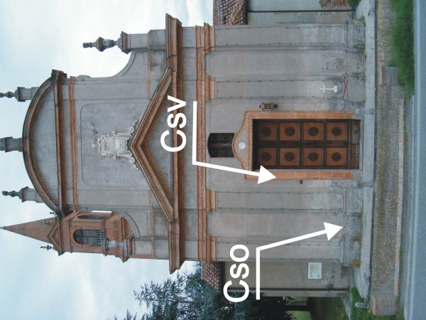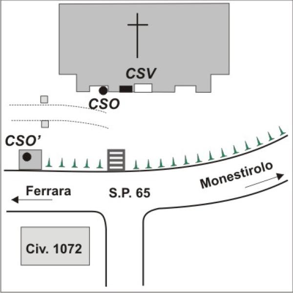 | Contrassegni | [{"simbolo_contrassegno":"P3","materializzazione":"(CSO) – Chiusino in ghisa posto alla sinistra della porta d'ingresso, nella rientranza. Il contrassegno fa parte della Rete Emilia Romagna – Rete Regionale di Controllo della Subsidenza n\u00b0060170."},{"simbolo_contrassegno":"B6","materializzazione":"(CSO') – Centrino in acciaio inox del tipo \"GPS C\" infisso sulla base in cemento posta lungo strada e alla sinistra della facciata della chiesa."},{"simbolo_contrassegno":"V3","materializzazione":"(CSV) – Piastrina antica infissa alla sinistra della porta d'ingresso della chiesa."}] |