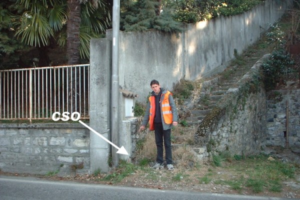 [{"simbolo_contrassegno":"B1","materializzazione":"(CSO) – Bullone infisso all'inizio del muro a retta della scalinata che conduce alla Chiesa, vicino all'angolo formato con il muro di recinzione della vicina propriet\u00e0, a destra della provinciale in direzione Sondrio, subito oltrepassato il n.c. 64."},{"simbolo_contrassegno":"V1","materializzazione":"(CSV) – Mensola infissa sulla facciata della casa al n.c. 64, spigolo di sinistra della facciata rivolta alla provinciale."}]