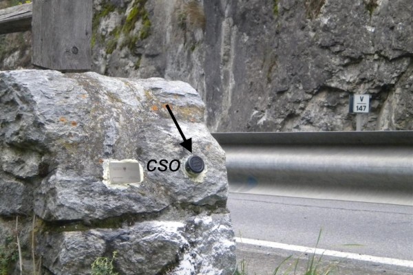 [{"simbolo_contrassegno":"B1","materializzazione":"(CSO) – Bullone infisso nella testata, volta verso il Passo dello Stelvio,del muro in pietre naturali, a valle della strada."},{"simbolo_contrassegno":"V1","materializzazione":"(CSV) – Mensola IGM infissa sulla parete rocciosa a monte della strada, in allineamento con il CSO."}]