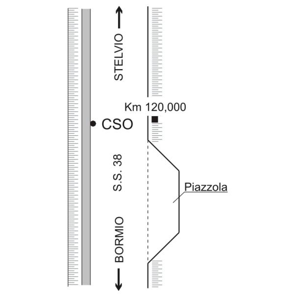 | Contrassegni | [{"simbolo_contrassegno":"B1","materializzazione":"(CSO) – Bullone infisso alla base del muro di scarpa, lato strada, a sinistra, direzione Stelvio, in corrispondenza del Km 120,000 della S.S. 38."}] |
