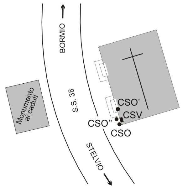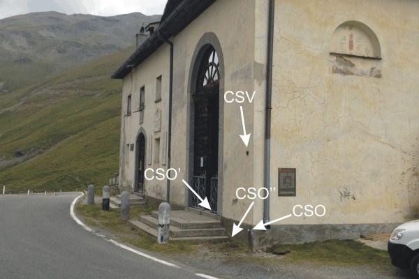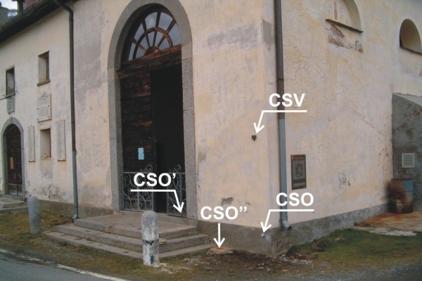 [{"simbolo_contrassegno":"B1","materializzazione":"(CSO) – Bullone infisso sulla facciata della Chiesa, nello spigolo destro."},{"simbolo_contrassegno":"B5","materializzazione":"(CSO') – Disco impiombato posto nella soglia della porta d'ingresso della chiesa, a destra."},{"simbolo_contrassegno":"P5","materializzazione":"(CSO'') – Pozzetto rialzato con tubo in PVC e protetto da tappo in ghisa posto alla base della facciata della chiesa, adiacente il primo gradino delle scale."},{"simbolo_contrassegno":"V1","materializzazione":"(CSV) – Mensola infissa sulla facciata della chiesa, spigolo di destra, fra il CSO'(pozzetto) e il CSO(bullone)."}]