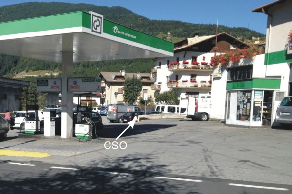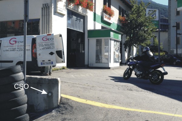 [{"simbolo_contrassegno":"B1","materializzazione":"(CSO) – Bullone infisso su un muretto in cemento armato che delimita l'area di servizio di un distributore con un parcheggio."}]