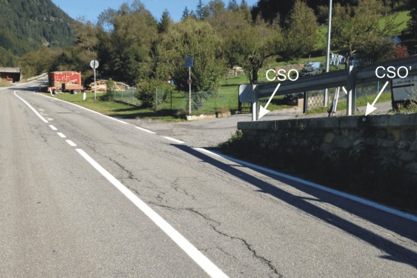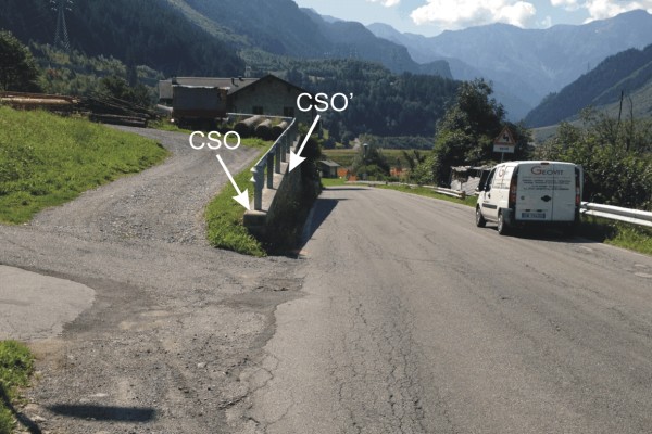 | Contrassegni | [{"simbolo_contrassegno":"B7","materializzazione":"(CSO) – Contrassegno orizzontale di altro ente, chiodo con con semisfera, infisso sul cordolo in calcestruzzo di un muro in pietra."},{"simbolo_contrassegno":"B1","materializzazione":"(CSO') – Bullone infisso sul cordolo in calcestruzzo di un muro in pietra, lato strada."}] |