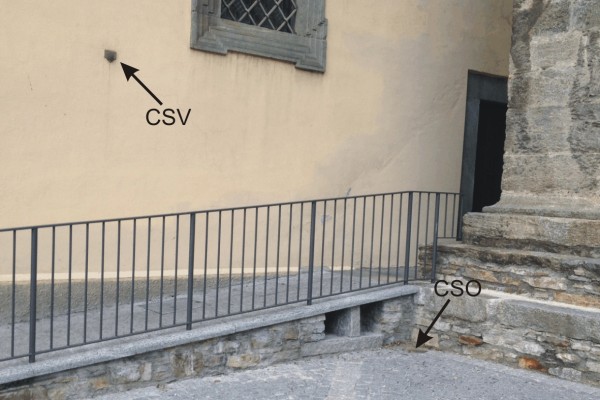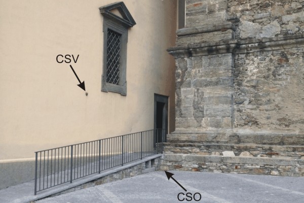 | Contrassegni | [{"simbolo_contrassegno":"P2","materializzazione":"(CSO) – Chiusino in ghisa di II categoria posto alla base del campanile, nell'angolo formato con la facciata della Chiesa."},{"simbolo_contrassegno":"V1","materializzazione":"(CSV) – Mensola infissa sul fianco della Chiesa, in corrispondenza del CSO."}] |