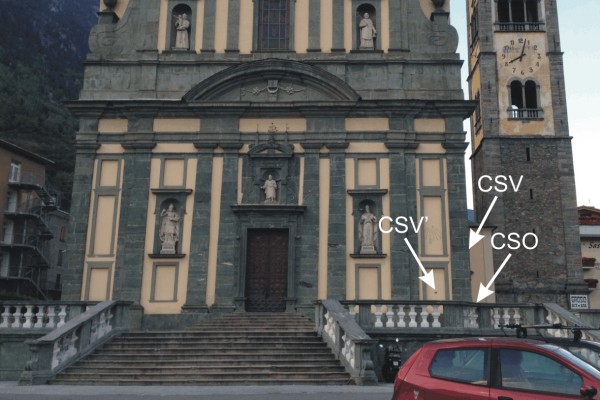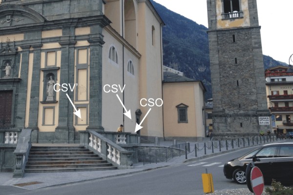 [{"simbolo_contrassegno":"P2","materializzazione":"(CSO) – Chiusino in ghisa di II categoria posto alla base della facciata lato strada, a sinistra della porticina."},{"simbolo_contrassegno":"V1","materializzazione":"(CSV) – Mensola infissa sulla facciata lato strada in corrispondenza del CSO."},{"simbolo_contrassegno":"V3","materializzazione":"(CSV') – Piastrina antica infissa nel vano di una finta finestra, sul lato destro della facciata principale."}]