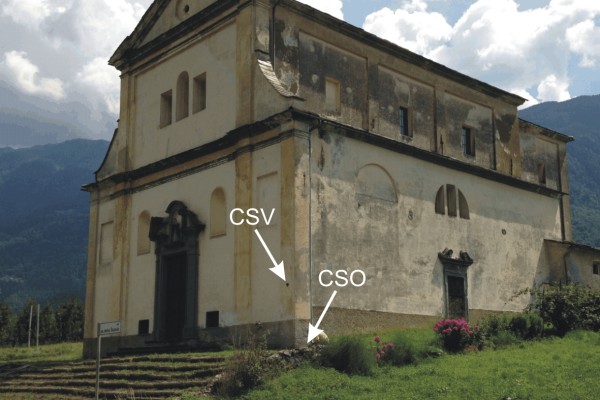 [{"simbolo_contrassegno":"P3","materializzazione":"(CSO) – Chiusino in ghisa di III categoria posto alla base del fianco destro della Chiesa, spigolo di sinistra."},{"simbolo_contrassegno":"V1","materializzazione":"(CSV) – Mensola infissa sulla facciata principale, spigolo di destra."}]