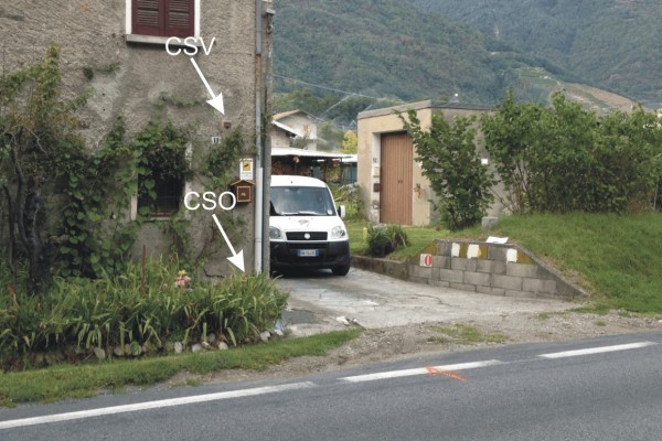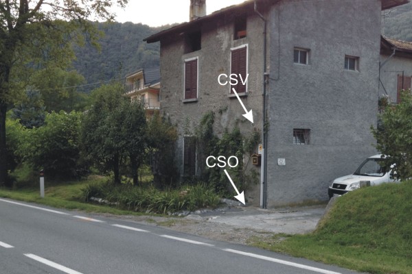 [{"simbolo_contrassegno":"P3","materializzazione":"CSO) – Chiusino in ghisa di III categoria posto alla base della facciata del civico n. 11, spigolo destro."},{"simbolo_contrassegno":"V1","materializzazione":"(CSV) – Mensola infissa sulla facciata del civico n. 11, in corrispondenza del CSO."}]