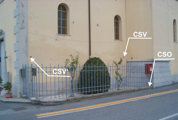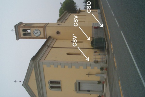 [{"simbolo_contrassegno":"B2","materializzazione":"(CSO) – Chiodo anonimo infisso sulla copertina del muretto di recinzione della chiesa, lato strada, spigolo destro."},{"simbolo_contrassegno":"V4","materializzazione":"(CSV) – Piastrina di altro Ente infissa sulla facciata in corrispondenza del CSO."},{"simbolo_contrassegno":"V4","materializzazione":"(CSV') – Piastrina di altro Ente infissa sulla facciata, lato S.P. 34, presso lo spigolo sinistro."}]