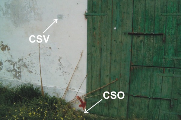 [{"simbolo_contrassegno":"B2","materializzazione":"(CSO) – Chiodo anonimo infisso sulla soglia , lato sinistro, del portone della stalla."},{"simbolo_contrassegno":"V4","materializzazione":"(CSV) – Piastrina di altro Ente posta in corrispondenza del CSO."}]