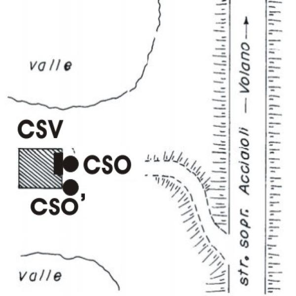 [{"simbolo_contrassegno":"B1","materializzazione":"(CSO) – Bullone di altro Ente, infisso nella parete rivolta alla strada a sinistra della porta."},{"simbolo_contrassegno":"V4","materializzazione":"(CSV) – Piastrina di altro Ente infissa in corrispondenza del CSO. Non misurata."},{"simbolo_contrassegno":"B2","materializzazione":"(CSO') – Chiodo infisso presso lo spigolo sinistro del marciapiede volto alla strada .Non misurato."}]