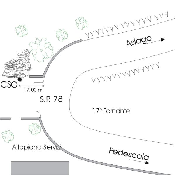 [{"simbolo_contrassegno":"B1","materializzazione":"(CSO) – Bullone infisso su roccia di fronte al cancello d' ingresso alla stazione di pompaggio dell' acquedotto dell' Altopiano Servizi, posto al tornante n\u00b0 17 della S.P. 78 al km 9,600."}]