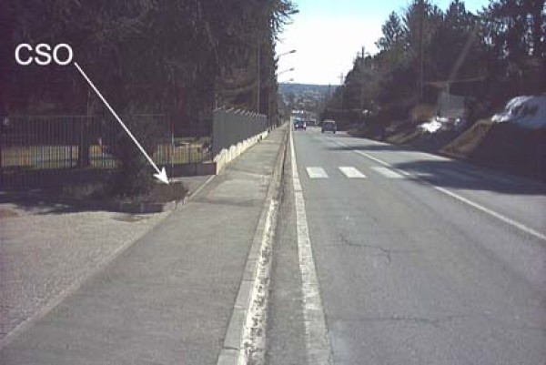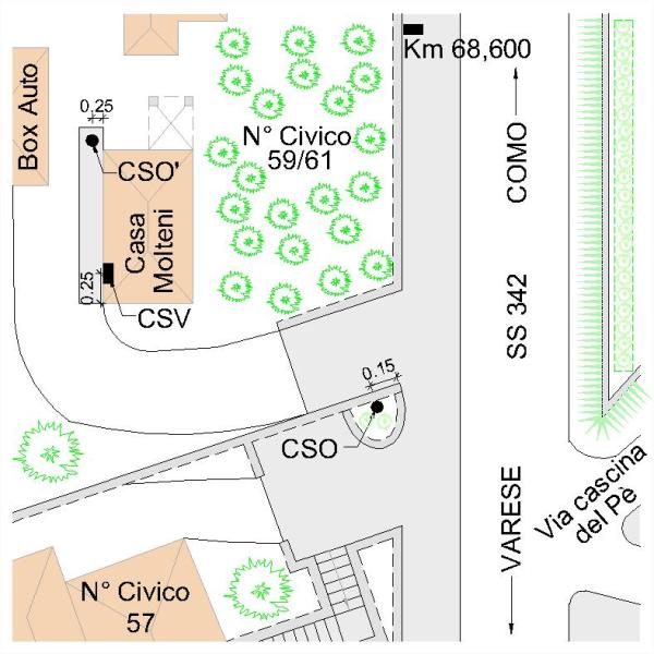 | Contrassegni | [{"simbolo_contrassegno":"B1","materializzazione":"(CSO) – Bullone infisso nel muretto di recinzione, a destra del cancello di accesso alla propriet\u00e0 al n\u00b0 civico 59\/61, lato esterno, spigolo verso la Statale."},{"simbolo_contrassegno":"P3","materializzazione":"(CSO') – Chiusino in ghisa posto all'interno della stessa propriet\u00e0, sul marciapiede opposto alla Statale, all'estremit\u00e0 sinistra appena fuori dal corpo del fabbricato, protetto da un chiusino anonimo in cemento."},{"simbolo_contrassegno":"V1","materializzazione":"(CSV) – Mensola cementata sulla facciata opposta alla Statale della stessa residenza, presso lo spigolo di destra."}] |