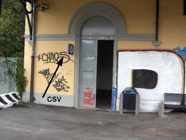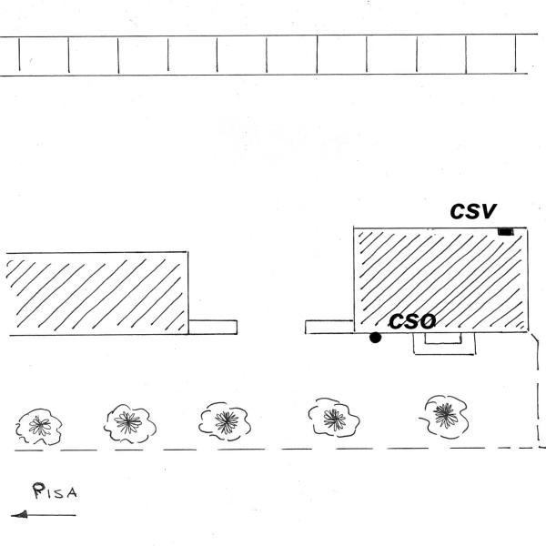 [{"simbolo_contrassegno":"B1","materializzazione":"(CSO) – Bullone infisso presso lo spigolo sinistro della facciata lato strada della stazione."},{"simbolo_contrassegno":"V3","materializzazione":"(CSV) – Piastrina antica a sinistra della porta a sinistra della facciata, lato binari."}]