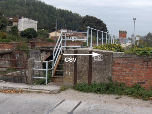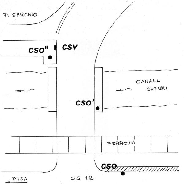 [{"simbolo_contrassegno":"B1","materializzazione":"(CSO) – Bullone infisso nel muro a retta a destra del passaggio a livello."},{"simbolo_contrassegno":"B4","materializzazione":"(CSO') – Centrino FS sul marciapiede a monte, riva sinistra, del ponte sul canale."},{"simbolo_contrassegno":"B2","materializzazione":"(CSO'') – Chiodo anonimo sulla sommit\u00e0 del muraglione diaframma fra il canale e il fiume Serchio."},{"simbolo_contrassegno":"V4","materializzazione":"(CSV) – Piastrina idrografica di Pisa murata all'estremit\u00e0 del muraglione."}]