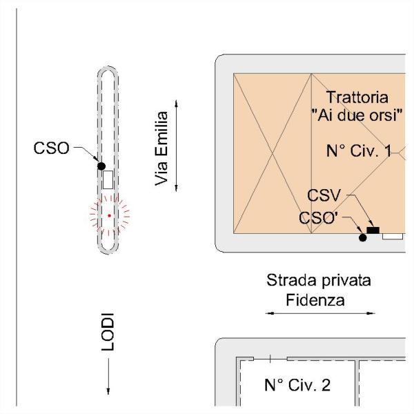 [{"simbolo_contrassegno":"B4","materializzazione":"(CSO) – Centrino universale infisso sulla soletta in cemento armato di base della colonnina Enel posta sullo spartitraffico di fronte alla trattoria."},{"simbolo_contrassegno":"B1","materializzazione":"(CSO') – Bullone infisso nella parete su Via Fidenza della trattoria \"Ai due orsi\", a sinistra della porta al numero civco 1. Misurabile solo con stadia da due metri a causa di un lume."},{"simbolo_contrassegno":"V4","materializzazione":"(CSV) – Targhetta del Catasto infissa nella stessa parete in corrispondenza del CSO'"}]