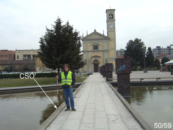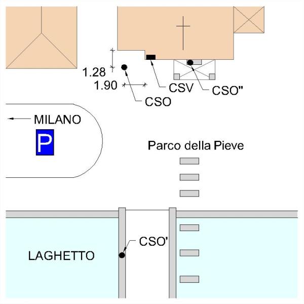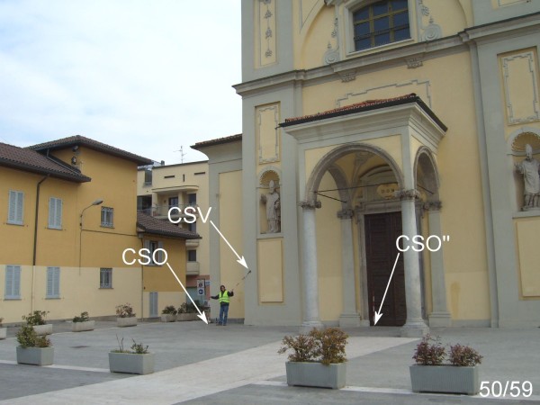 [{"simbolo_contrassegno":"P2","materializzazione":"(CSO) – Chiusino in ghisa, interrato in prossimit\u00e0 dello spigolo siinistro della Chiesa, ricoperto da una mattonella amovibile."},{"simbolo_contrassegno":"B4","materializzazione":"(CSO') – Centrino universale infisso sul cordolo di cemento del ponticello attraversante il laghetto di fronte alla Chiesa, a sinistra guardando la Chiesa."},{"simbolo_contrassegno":"B5","materializzazione":"(CSO'') – Disco impiombato sulla soglia del portone della Chiesa, a sinistra entrando."},{"simbolo_contrassegno":"V1","materializzazione":"(CSV) – Mensola infissa sulla facciata della Chiesa a sinistra del portone, spigolo dell'avamcorpo."}]